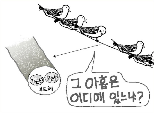석양이 지는 김포평야를 지날 때 아들이 질문한다. “아빠 참새가 전기줄에 앉아있는데 왜 안 죽어?” 감전을 무서워했던 어릴 적 나도 참 궁금했었다. 이 궁금함은 전기줄의 구조만 알면 이해가 된다. 단면이 보이도록 칼로 전기줄 가운데를 자른다. 전기가 오고 가는 두 줄 혹은 서너 줄의 도체가 보이고 그 밖을 각각 둘러싸고 있는 피복테이프와 이 모든 것을 감싸고 있는 PVC로 된 것이 보인다.